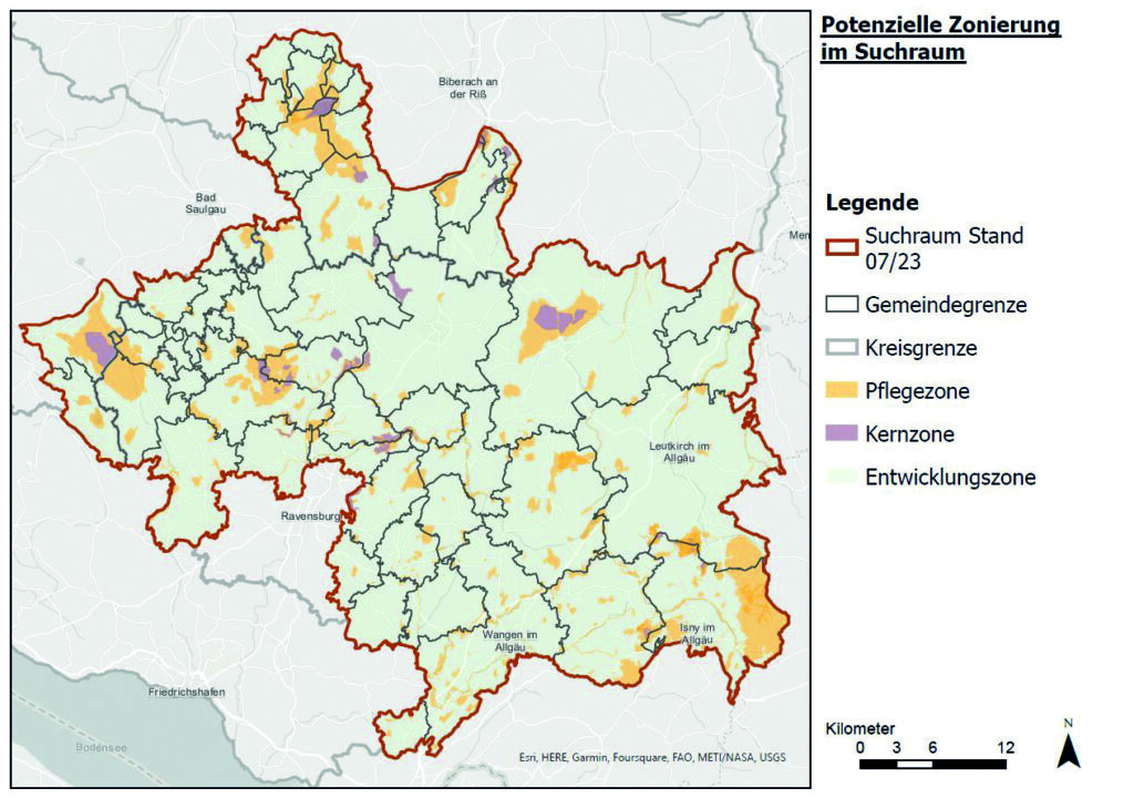 Der Suchraum für die Abgrenzung des Biosphärengebiets umfasst 180.000 Hektar und drei Landkreise: RV, BC und SIG mit insgesamt 57 Gemeinden. Das Gebiet gliedert sich in drei Zonen (Kern-, Pflege- und Entwicklungszone), daraus ergibt sich ein „Flickenteppich“ mit unterschiedlichen Schutz- und Handlungsoptionen.  www.rv.de/landkreis/aktuelle+projekte/nachhaltige+kreisentwicklung/suchraum