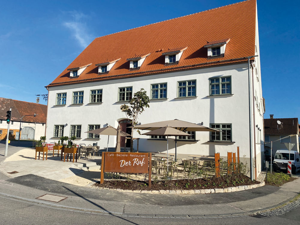 Seit 4. September ist die Familie im Haus gegenüber Pächter des Gasthauses mit Bäckerei. Im vorbildlich renovierten monumentalen „Ochsen“, in dessen Saal schon Bernd Rufs Eltern ihre Hochzeit gefeiert hatten. Das baufällige Gebäude war lange ein Schandfleck in der knapp Tausend-Seelen-Gemeinde Erlenmoos, die 18 Kilometer von Biberach und 22 von Memmingen entfernt liegt. Zu Erlenmoos gehören noch die Ortsteile Edenbachen, Eichbühl und Oberstetten, mit weiteren 800 Menschen. Seit Anfang September beherbergt das Schmuckstück an der Bundestraße 312 im Zentrum von Erlenmoos die Gemeindeverwaltung, einen Saal, der sowohl von der Gemeinde als auch von Rufs genutzt werden kann und den Gastronomiebetrieb „Der Ruf. Café. Bäckerei. Restaurant“. Der moderne Verkaufsraum mit hellen Eichendielen im ehrwürdigen alten Gewölbe ist gleichzeitig Café und Restaurant mit Mittagstisch, zweimal wöchentlich kann man auch abends zum Essen auf den stilvollen schwarzen Stühlen Platz nehmen. Neben der Familie Ruf sind noch weitere 15 Mitarbeiterinnen am Start und seit kurzem arbeitet auch ein Koch mit, um unter anderem die 35 Gäste zu verwöhnen. Weitere 45 Plätze gibt es im Außenbereich an der Straße, 75 Sitzplätze bietet der Saal. Auf dem Weg zur Toilette sieht man noch, wo früher mit Gerste Bier gebraut wurde.