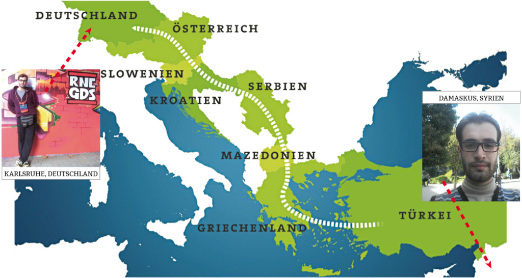 Rund 4000 Kilometer legte Mohammad Milad Audeh 2015 zurück, bevor der damals 24-jährige Syrer aus Damaskus geflohen, im November 2015 in Bad Waldsee strandete. Grafik: BLIX