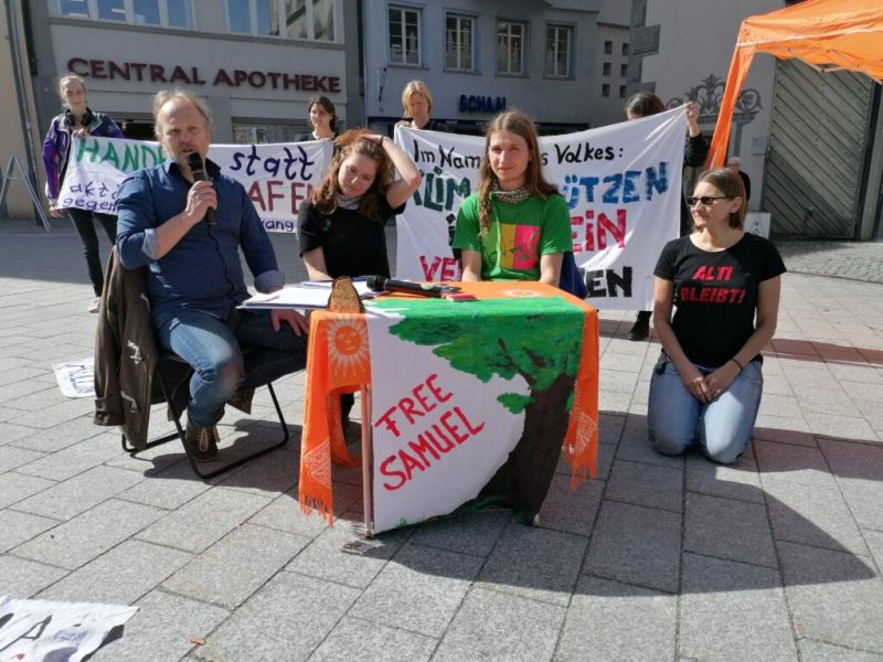 Ravensburg – Vom Baum in die Jugendarrestanstalt (JAA) und zurück. So könnte die Kurzfassung der Geschichte lauten, die dem Umweltaktivisten Samuel Bosch (21) widerfahren ist, und die er und seine MitstreiterInnen nach seiner nächtlichen Haftentlassung bei einer Open-Air-Pressekonferenz am 5. April auf dem Ravensburger Marienplatz etwas ausführlicher erzählten.