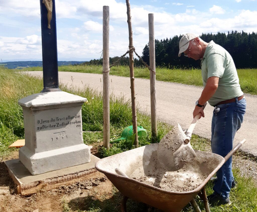 Graben – Beim Eingang zum beliebten, viel besuchten Landschaftsschutzgebiet „Grabener Höhe“ steht seit 1874 ein Wegkreuz, das mit seiner goldfarbenen Christusfigur ausgerichtet ist hin zum Weiler Graben. In diesem Sommer wurde es von Privat saniert.