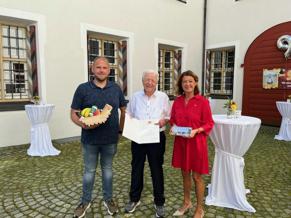 Bad Waldsee – Am 12. August feierte Erwin Kübler seinen 90. Geburtstag im Kreise seiner Verwandten und Freunde im Pfarrsaal in Haisterkirch. Bürgermeisterin Monika Ludy überbrachte dem Jubilar gemeinsam mit Ortsvorsteher Matthias Covic die herzlichsten Glückwünsche im Auftrag von Oberbürgermeister Matthias Henne. Verbunden mit den Glückwünschen übergab die Bürgermeisterin einen regionalen und fair gehandelten Geschenkkorb, eine Urkunde von Ministerpräsident Winfried Kretschmann und eine Glückwunschkarte der Stadt Bad Waldsee. Erwin Kübler freute sich sehr über den Besuch und die Anerkennung der Stadt.