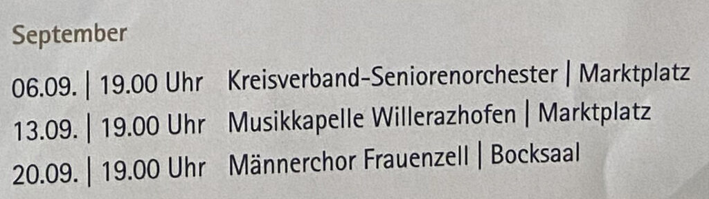 Leutkirch – Die Standkonzerte auf dem Marktplatz sind eine schöne Tradition. Nachstehend die letzten Termine im September (Ausschnitt aus dem Plakat, fotografiert von Julian Aicher):