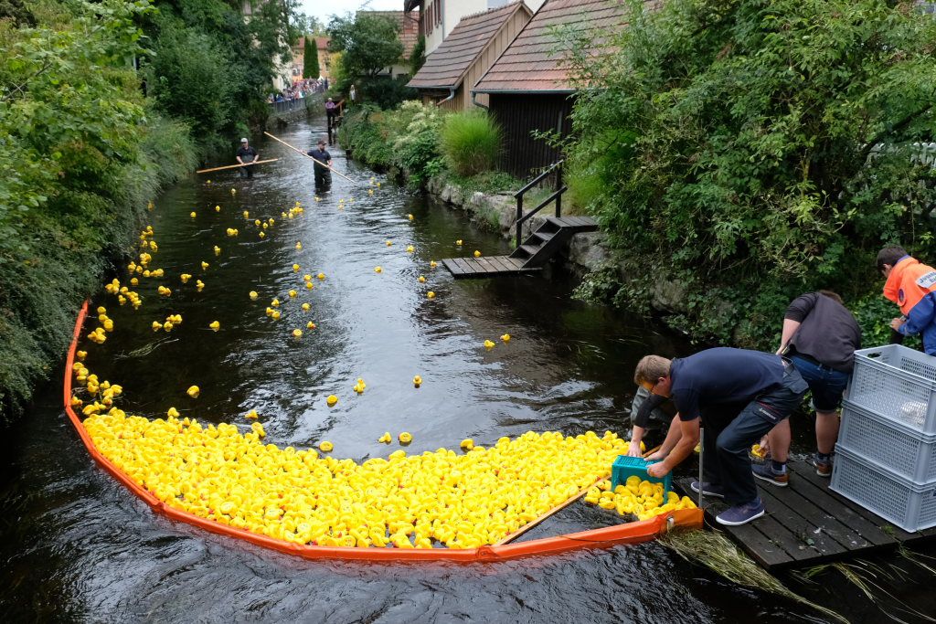 Bad Wurzach – Auch in seiner 16. Auflage hat das von der Volksbank-Allgäu Oberschwaben gesponserte und von der Jugendfeuerwehr Bad Wurzach im Rahmen des Stadtfestes durchgeführte Entenrennen auf der Ach nichts von seiner Faszination eingebüßt.