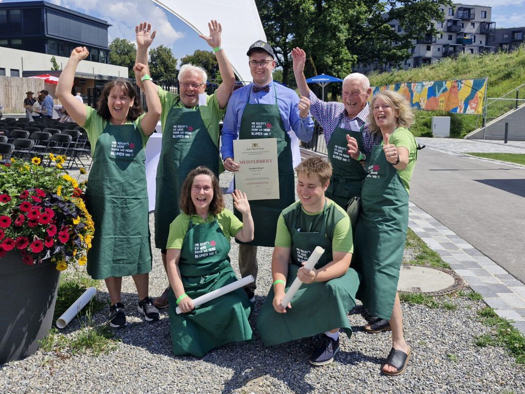 Wangen im Allgäu / Arnach (rei) – Bei einer feierlichen Übergabe auf der Landesgartenschau in Wangen im Allgäu erhielten Meisterinnen und Meister im Garten- und Landschaftsbau sowie im Blumen- und Zierpflanzenbau ihre Meisterbriefe. Übergeben wurden die Urkunden von Staatssekretärin Sabine Kurtz MdL (Ministerium für Ernährung, Ländlichen Raum und Verbraucherschutz). Einer der besten Absolventen war der frischgebackene Gärtnermeister Jonathan Burger aus Alttann. Er hat seine Ausbildung beim Gärtnereibetrieb Grad in Arnach gemacht (wo er auch weiterhin beschäftigt ist).