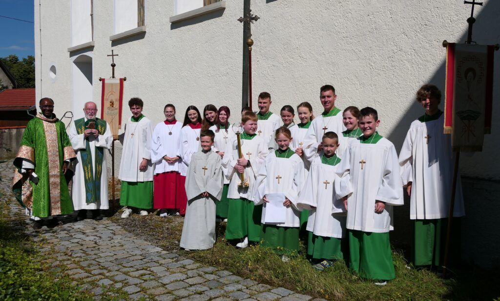 Molpertshaus – Mit insgesamt 17 Ministrantinnen und Ministranten aus den Kirchengemeinden Molpertshaus, Bergatreute und Alttann haben Pfarrer i. R. Adolf Schuhmacher und sein Bruder im geistlichen Amt, Dr. Juvenal Ilunga Muya aus Kolwezi im Süden der Demokratischen Republik Kongo, am 14. Juli in der Pfarrkirche St. Katharina in Molpertshaus Gottesdienst gefeiert. Organisiert und in weiten Teilen vorbereitet wurde der Gottesdienst von Ellen Liebrich und Simon Kling, dem Oberministranten-Duo der derzeit 25 Ministrantinnen und Ministranten von Molpertshaus.