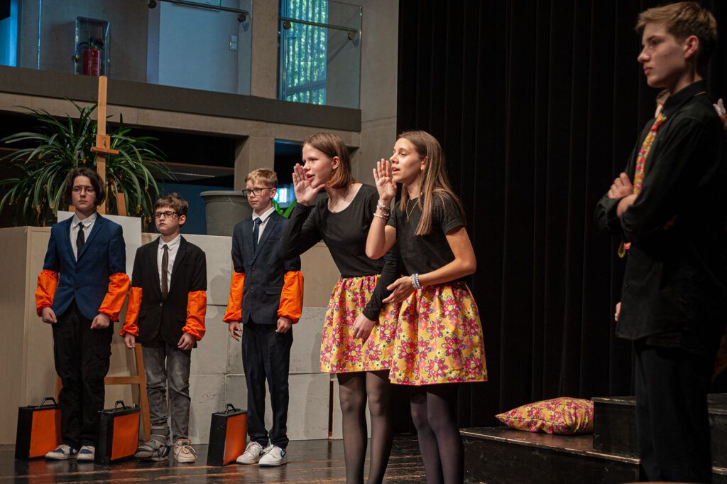 Leutkirch – In weniger als 60 Minuten wurden die Fragen gestellt, die im Zentrum unseres Lebens stehen: Wer bin ich? Was macht mich als Menschen aus? Wie können wir es schaffen, miteinander zu leben, einander zu ertragen, zu respektieren und ja, zu lieben? Mit ihrer modernen Bearbeitung der 1912 erschienenen Erzählung „Die Verwandlung“ von Franz Kafka überzeugten die 60 Schülerinnen und Schüler von Chor und Theater-AG des Hans-Multscher-Gymnasiums an beiden Aufführungsabenden im voll besetzten Cubus ihr Publikum. Nicht nur durch große Spielfreude, sondern auch durch die Dringlichkeit, mit der sie die Botschaft des über 100 Jahre alten Textes vermittelten. Keine geringe Leistung, vor allem, wenn man bedenkt, dass die meisten der jungen Schauspieler aus den Klassenstufen 5 bis 7 kommen.