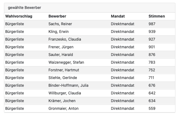 Stärkster CDU-Bewerber im Bereich Bad Wurzach ist Heinrich Vincon (3236 Stimmen; in Kißlegg 524). Er liegt deutlich vor Bürgermeisterin Scherer (2380; 535). Bei den Freien Wählern punkteten im Bereich Bad Wurzach Karl-Heinz Buschle (2686 / in Kißlegg 183) und Matthias Grad (2261/599) am meisten – vor André Radke, der als in Bad Wurzach arbeitender Kißlegger im Bereich Bad Wurzach stolze 1680 Stimmen holte.