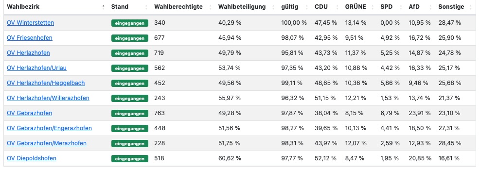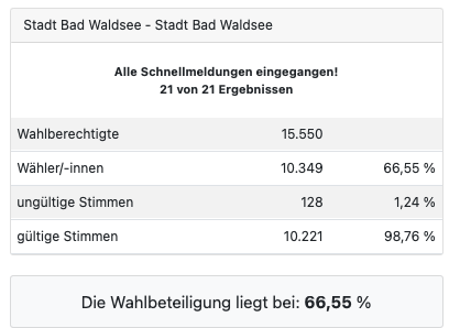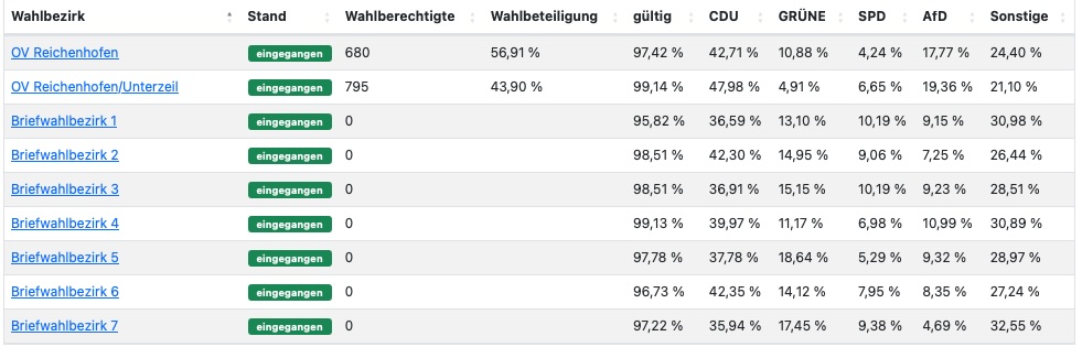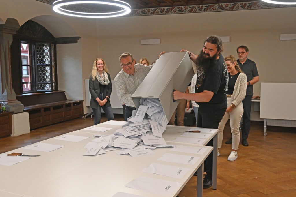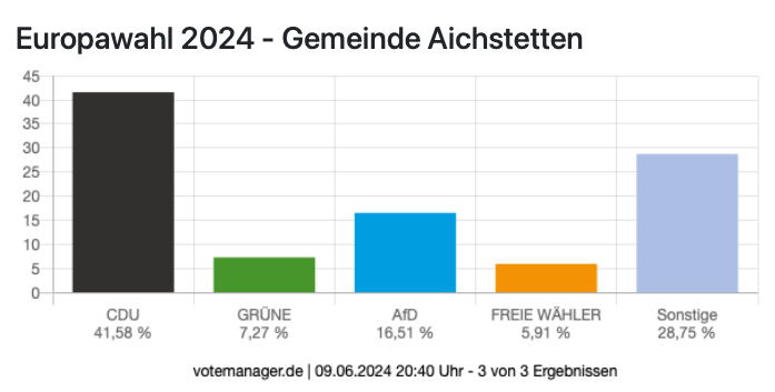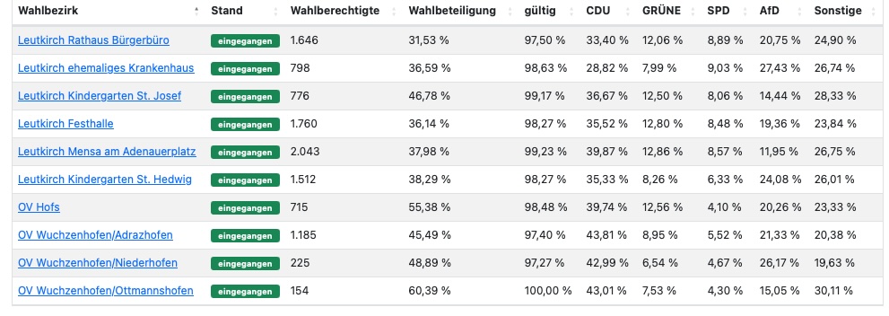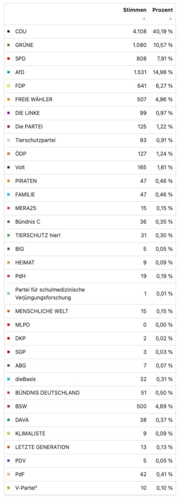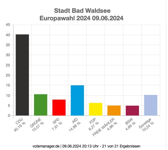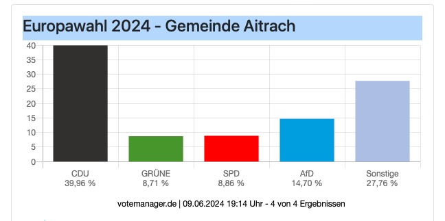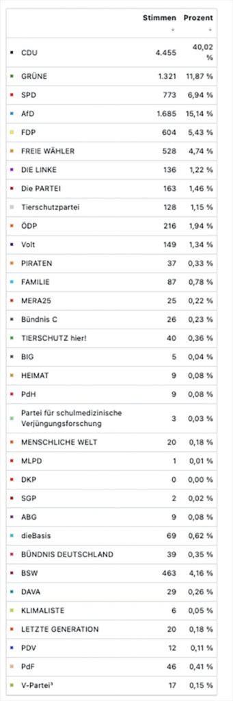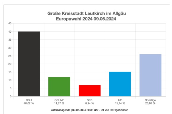 Leutkirch (rei) – Klarer Wahlsieg der CDU bei der Europawahl: Nach Auszählung aller 29 Bezirke liegt die CDU im Bereich der Großen Kreisstadt Leutkirch bei 40,0 %. Zweitstärkste Kraft in Leutkirch wurde die AfD mit 15,1 %. Die Kanzlerpartei SPD erlebte einen Absturz auf knapp 7 %. Die Grünen liegen bei 11,9 % . Die Wahlbeteiligung wird von der Stadt mit 65,9 % angegeben (11.356 Wähler bei 17.239 Wahlberechtigten). Die Wahlsiegerin CDU hat ihre stärksten Bastionen in Diepoldshofen (52,1 Prozent) und in Willerazhofen (51,2 Prozent). Die AfD erzielte ihre besten Ergebnisse in Wahlbezirk „Leutkirch ehemaliges Krankenhaus“ mit 27,4 Prozent, gefolgt von Niederhofen mit 26,2 Prozent. Unten im Artikel die detaillierten Ergebnisse, entnommen der Webseite der Stadt Leutkirch. Die Tabellen sind auch hinterlegt unter Download – dort im PDF-Format.