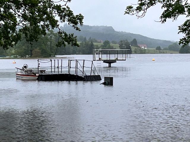 Kißlegg – „Ein sehr anstrengender Tag des Hochwassers in Kißlegg neigt sich dem Ende zu“, schreibt uns um 20.50 Uhr Kißleggs Bürgermeister Dieter Krattenmacher und schickt etliche Bilder vom Hochwasser in seiner Gemeinde. „Feuerwehr, Bauhof, Gemeindehausmeister und Johanniter waren/sind pausenlos im Einsatz, um die Auswirkungen des Hochwassers möglichst im Schach zu halten.“ Der Wasserspiegel des Obersees ist um rund 2 Meter angestiegen. Aus dem 3-Meter-Sprungturm wurde einer mit einem Meter. Nachstehend die Bilder aus Kißlegg: