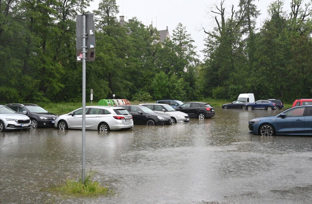 Bad Waldsee – Der endlos niederprasselnde Regen bescherte Bad Waldsee ein paar neue Seen. Der untere Teil des Bleicheparkplatzes ist fast vollständig überflutet. Wer sein Auto nicht rechtzeitig in Sicherheit brachte, ist gut beraten, sich hohe Gummistiefel anzuziehen, um sein Gefährt noch trockenen Fußes zu erreichen. Bürgermeisterin Ludy und Feuerwehrkommandant Burkhardt sind seit dem frühen Morgen im Einsatz und informieren sich vor Ort von der aktuellen Situation. Unser Reporter war heute Morgen ab 7.30 Uhr unterwegs. Die Fotos stammen aus dem Zeitraum 7.30 Uhr bis 9.30 Uhr-