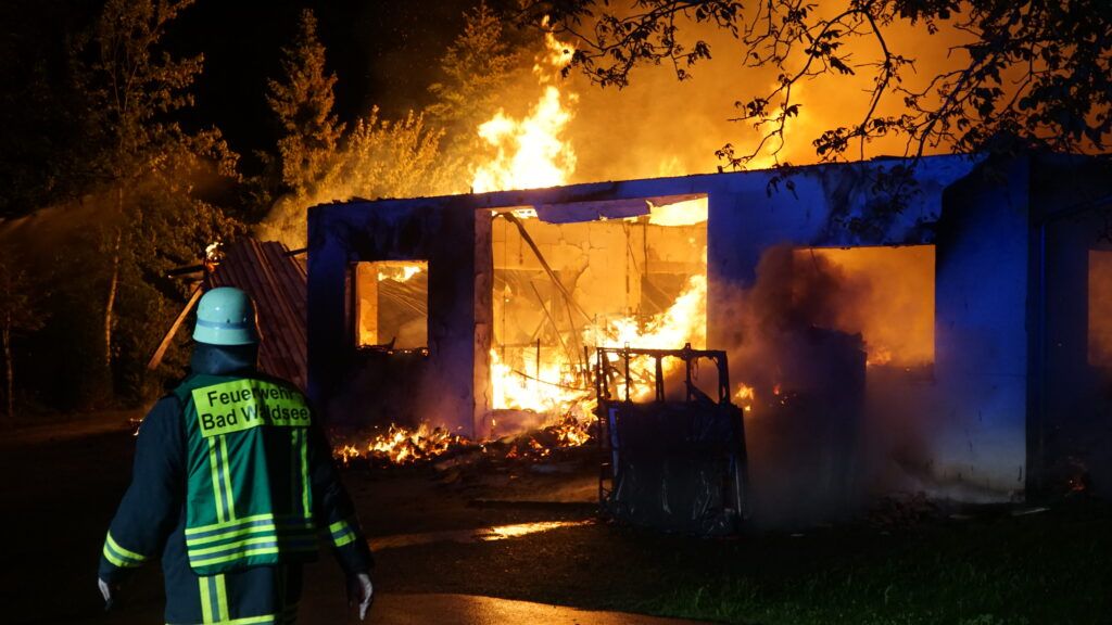 Rötenbach (rei) – In Rötenbach (Gemeinde Wolfegg) ist eine Schreinerei abgebrannt. Wie uns das Südwestdeutsche Mediennetzwerk GmbH um 5.29 Uhr mitteilte, waren rund 80 Einsatzkräfte von Feuerwehr und Rettungsdienst vor Ort. Es wurde eine Wasserwand errichtet, um ein Übergreifen des Brandes auf ein benachbartes Wohnhaus zu verhindern. Der Schaden beläuft sich auf geschätzt 600.000 €, teilte uns die Polizei auf Anfrage mit. Verletzt wurde niemand. Im Einsatz waren Wehrleute aus Wolfegg, Bad Waldsee, Vogt und Weingarten. Die Brandursache ist noch nicht bekannt, die polizeilichen Ermittlungen dauern an. Die Nachlöscharbeiten gehen heute voraussichtlich noch über den ganzen Vormittag.
