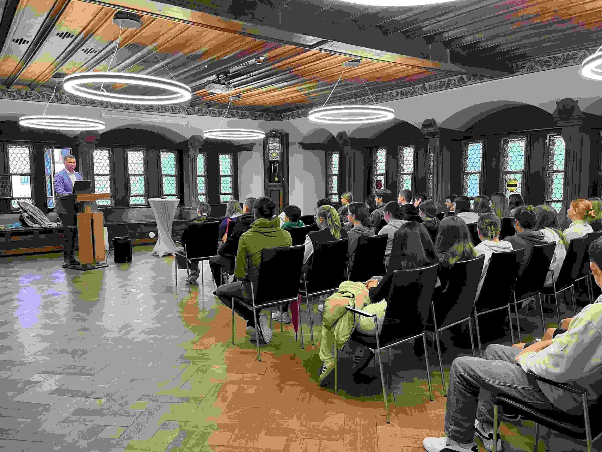 Bad Waldsee – Im Rahmen des neuen Unterrichtsfaches „Lebenswerkstatt“ waren die 8. Klassen der Eugen-Bolz-Schule zu Besuch bei unserem Oberbürgermeister Mathias Henne im historischen Sitzungssaal im Rathaus.