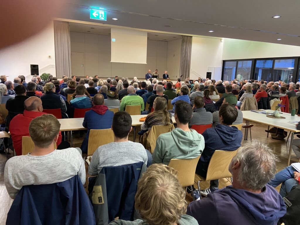 Kißlegg – Ragen ab 2027 drei 175 Meter hohe Windkraft-Türme aus dem Bremberger Wald? Bis zur Rotorspitze hätten die WKA eine Höhe von mehr als 260 Metern. Falls ja: Wieviel Strom entsteht dort voraussichtlich? Aber auch: Wie beeinflussen diese Bauten die Moore im genannten Forstgebiet? Und wie wirkt sich das auf die zwölf privaten Brunnen rund um den Bremberger Wald aus? Um solche und viele andere Fragen ging es am Mittwochabend, 17. April, in der Mensa Kisslegg. Dass sie rappelvoll war, zeigte das große Interesse der Bürgerschaft.