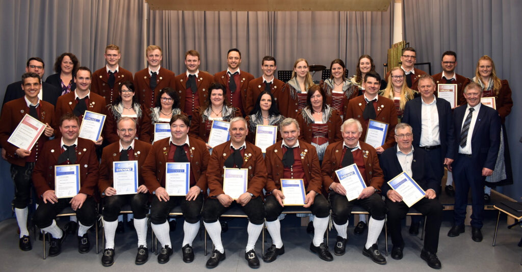 Willerazhofen – Die letzte aller Jubiläumsveranstaltungen zum 100-jährigen Bestehen der MK Willerazhofen (MKW) war am Samstagabend ein Doppelkonzert mit der Patenkapelle aus Heggelbach in der Turn- und Festhalle Willerazhofen. In diesem Rahmen konnte fast die halbe Kapelle mit Ehrennadeln ausgezeichnet werden, darunter acht 10-jährige, vier 20-jährige, fünf 30-jährige, vier 40-jährige und mit Martin Bareth, Georg Reich und Rupert Waizenegger sogar drei 60-jährige Mitgliedschaften. Dirigent Manfred Schuhmacher erhielt die Dirigentennadel in Gold mit Diamant für 25-jährigen Einsatz und großes Engagement als Ausbilder, Musiker, Initiator und Dirigent.
