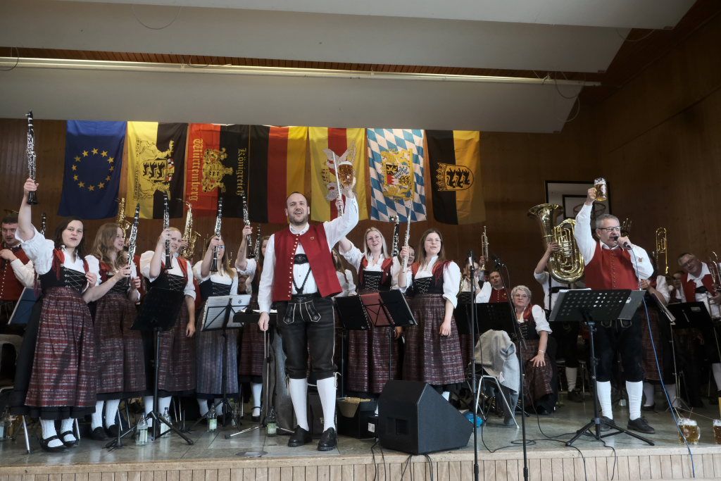Als Stefanie Jöchle, die Vorstandssprecherin des MV Arnach, den zu Ehrenden zum Rednerpult rief, erhoben sich alle, um dem Jubilar stehende Ovationen zu entbieten.