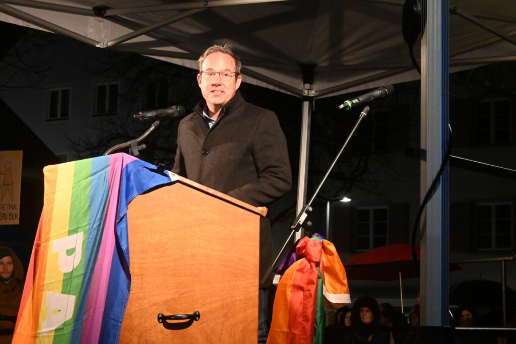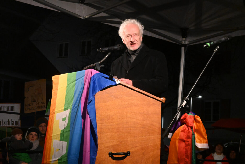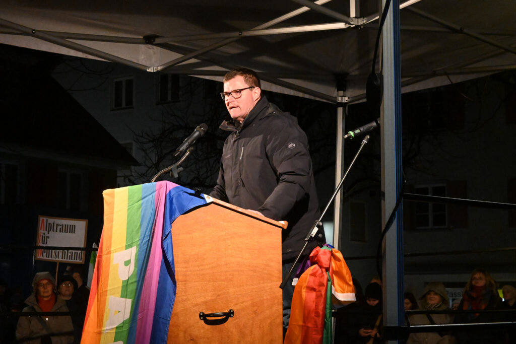 Raimund Haser, MdL, hielt ebenfalls eine sehr persönliche Rede. Seines Vaters Familie wurde nach dem Zweiten Weltkrieg aus dem ehemaligen Jugoslawien vertrieben. Sie verloren alles Hab und Gut und wurden dort völlig rechtlos gestellt. Das passiere heute wieder in vielen anderen Gebieten. Aber dass er solche Pläne mal in Deutschland kritisieren müsse, hätte er nicht gedacht. Und dann nimmt er mit vier Sätzen das komplette Programm der AfD auseinander. „Wer bei dieser Bedrohungslage für einen Austritt aus der Nato ist, wer angesichts der schwierigen Lage für die Landwirtschaft und energieintensiver Industrien für die Streichung sämtlicher Subventionen ist, wer bei unserem Fachkräftemangel eine völkisch geprägte, ausländerfeindliche Politik macht und wer angesichts des durch die EU gewachsenen Wohlstandes für das Ende der EU plädiert, den muss man nicht verbieten, der verbietet sich selbst.“