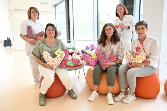 Ravensburg – Der Katholische Deutsche Frauenbund aus dem bayerischen Dasing hat für die Brustkrebspatientinnen der Frauenklinik am St. Elisabethen-Klinikum (EK) 100 Herzkissen genäht. Mit einem aufmunternden Spruch und dem Namen der jeweiligen Näherin versehen, sollen die weichen Kissen den frisch operierten Frauen Trost spenden und gleichzeitig dabei helfen, das Gewebe zu schonen.