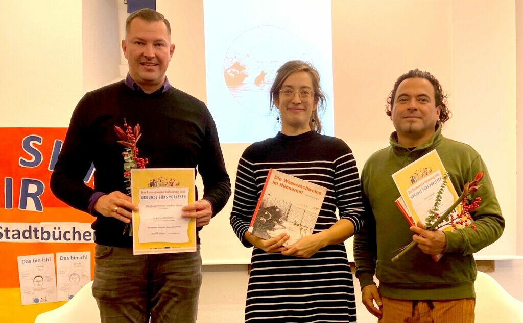 Bad Waldsee – Am Freitag, 17. November, wurde in der Stadtbücherei Bad Waldsee der alljährliche bundesweite Vorlesetag gefeiert: Oberbürgermeister Matthias Henne sowie der spanischsprachige Bürger Luis Coronado lasen die Bilderbuchgeschichte „Die Wasserschweine im Hühnerhof – Los carpinchos“ auf Deutsch und Spanisch vor.
