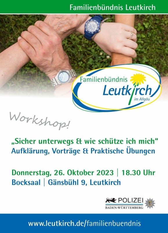 Das Familienbündnis lädt am Donnerstag, 26.10.2023 um 18:30 Uhr, in den Bocksaal zum Workshop „Sicher unterwegs und wie kann ich mich schützen“ ein.