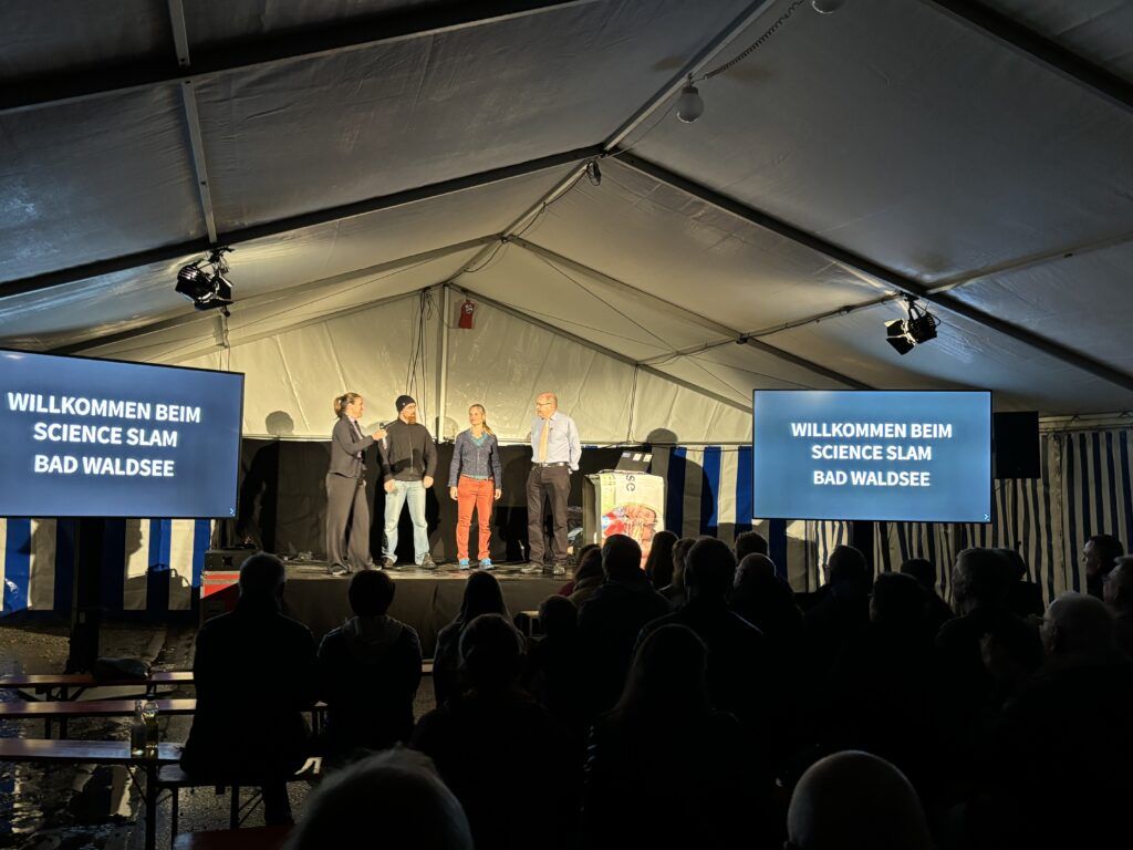Bad Waldsee – Die Premiere ist gelungen, auch wenn bei ergiebigem Dauerregen nur gut sechzig Besucher den Weg ins „Bildungszelt“ auf der Bleiche zum ersten Science Slam in der Großen Kreisstadt gefunden hatten.