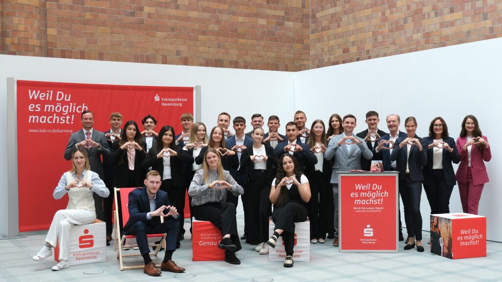 Ravensburg – Die Kreissparkasse Ravensburg freut sich in diesem Jahr über steigende Bewerberzahlen und macht deshalb 13 Bankkaufleuten, sieben Bankkaufleuten mit Zusatzqualifikation Privates Vermögensmanagement und drei Bachelor-Studenten eine qualifizierte Ausbildung möglich. Im Moment sind bei der Kreissparkasse rund 50 junge Frauen und Männer in Ausbildung oder Studium und füllen das Kampagnenmotto „Was bei uns in der Ausbildung zählt – Genau Du!“ mit Leben. Damit ist das Kreditinstitut einer der größten kaufmännischen Ausbildungsbetriebe im Landkreis.